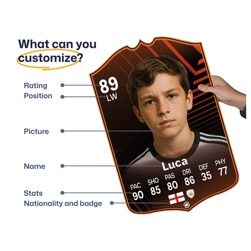 When it comes to personalising your card, the basic steps are to upload a photo and add a name to your card. Then you’ll add details like your player’s position and skill ratings out of 99 for each football skill shown on the card. Our online card builder makes this really easy. And if you aren’t a football card expert, don’t worry!