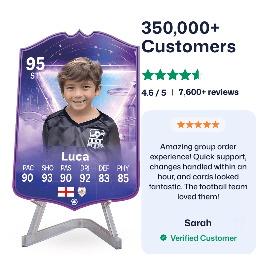 Once you’ve personalised your card, our design experts will edit your photo, design your card, and bring it to life in stunning quality. You’ll get a full preview before we print your card and every card’s quality is backed by our Gold Standard Guarantee. So far, over 350,000+ football fans agree: A CardsPlug football card is the ultimate football gift!