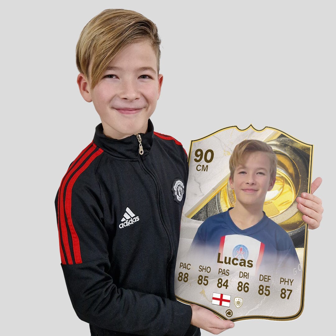 When it comes to personalising your card, the basic steps are to upload a photo and add a name to your card. Then you’ll add details like your player’s position and skill ratings out of 99 for each football skill shown on the card. Our online card builder makes this really easy. And if you aren’t a football card expert, don’t worry!